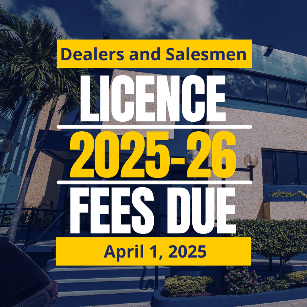 The licence is renewable annually (April 1st) and should be displayed in your dealership.
